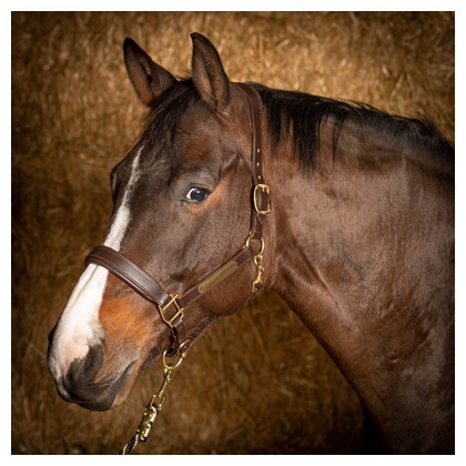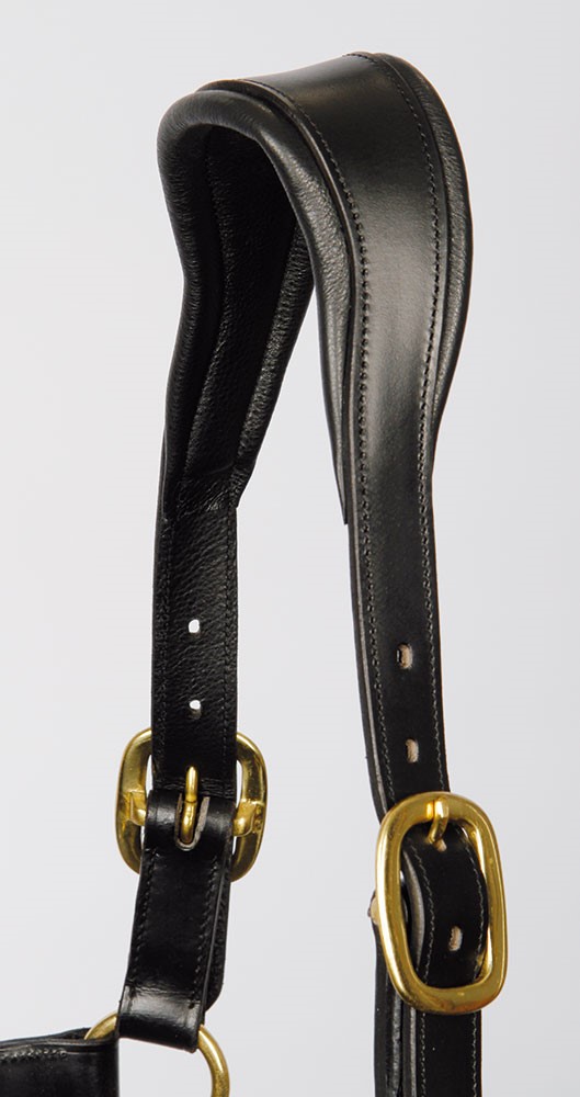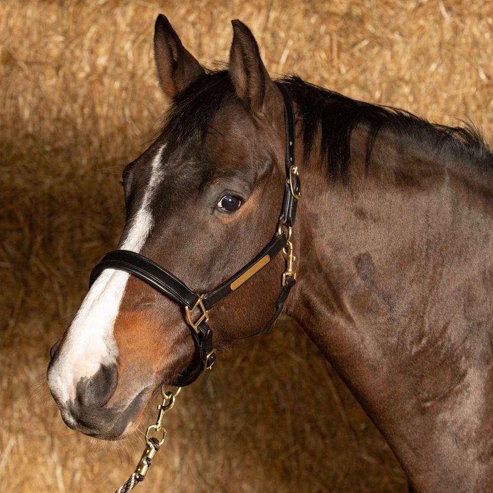 Luxe lederen halster met anatomisch kopstuk. Dubbel verstelbaar kopstuk en verstelbaar op de neus. Extra soepel en comfortabel, zacht onderlegd. Met goudkleurig plaatje op het bakstuk om te graveren.