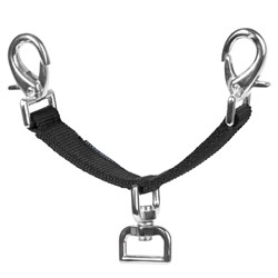 Koppelstuk voor bij het longeren. Bevestiging door middel van musketon aan bit of halster. In het midden een vrijdraaiende ring. Fournituren zijn zilverkleurig.